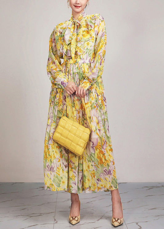 Belle robe longue en mousseline de soie à lacets et imprimé jaune à manches longues AR1037