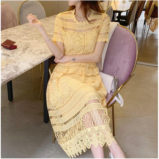 Robe courte rose chic à col rond et manches bouffantes en dentelle ajourée à taille haute AR1010