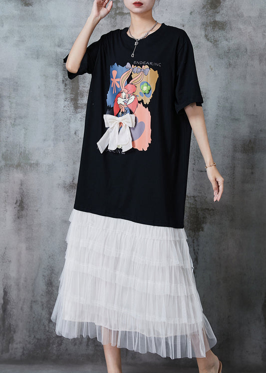 Robe longue décontractée en coton patchwork avec nœud de dessin animé noir pour l'été QA1017