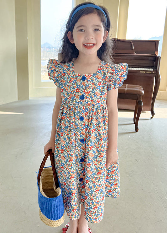 Jolie robe longue d'été en coton imprimé à volants bleu pour fille TT015