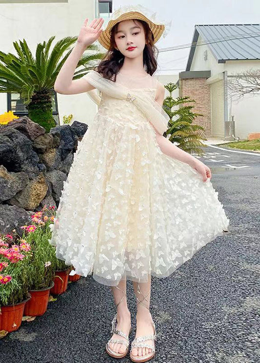 Belles robes longues en tulle à col rond beiges pour filles, motif papillon, été TT033