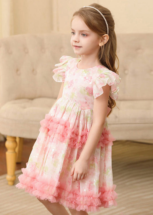 Robe longue en tulle à volants et imprimé patchwork rose pour fille, manches courtes, EW019