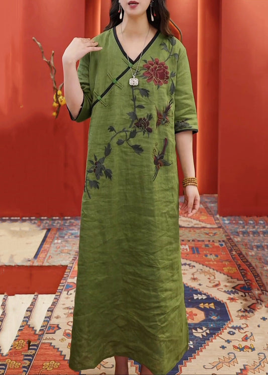 Robe longue à boutons et imprimé vert rétro pour l'été VV023