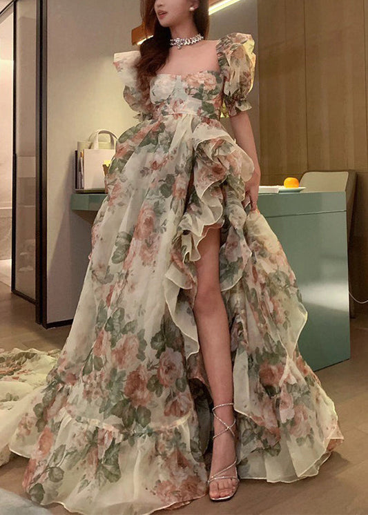 Belle robe longue en mousseline de soie à imprimé bleu avec volants et ouverture latérale pour l'été XX041