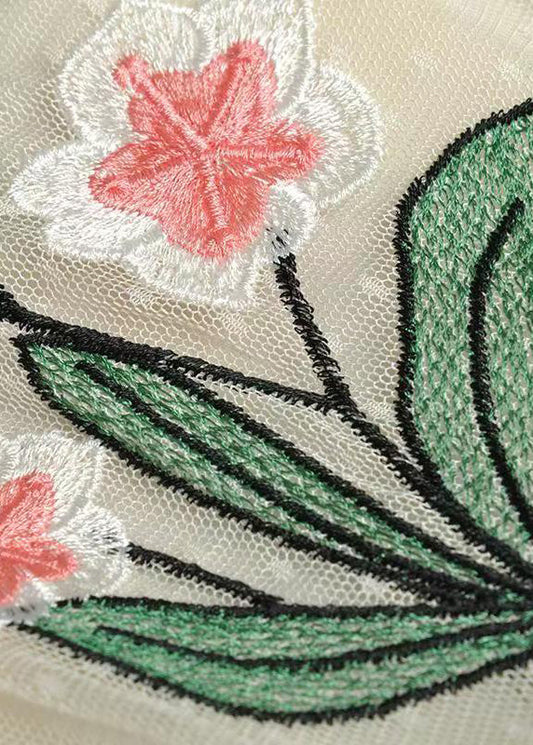 Robe en tulle patchwork brodée à col carré et manches longues abricot fin XX074