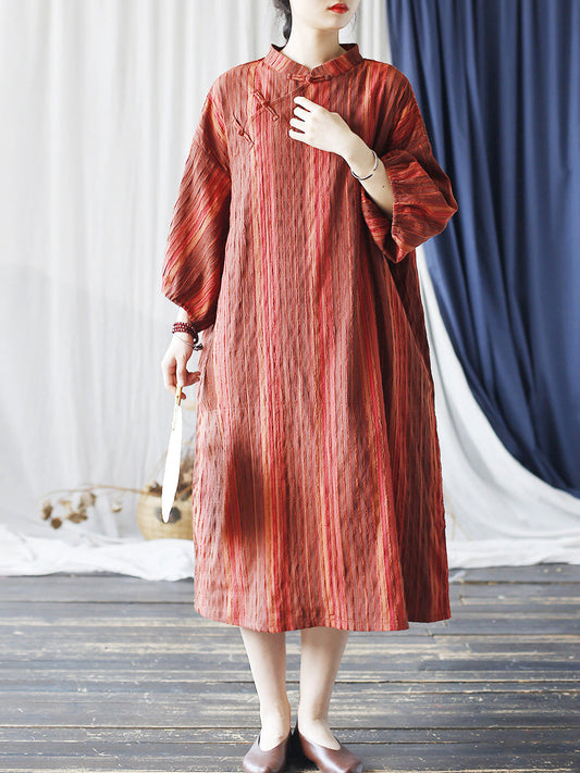 Robe d'été vintage en ramie à col montant et boucle fleurie pour femme LL010