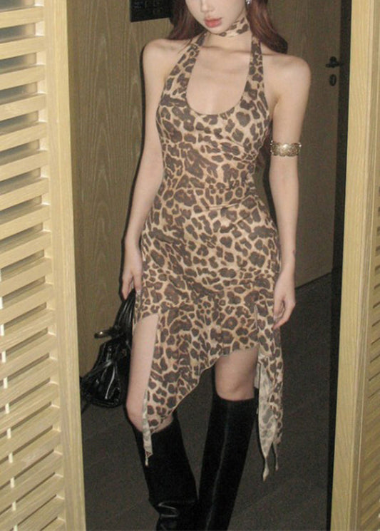 Robe d'été asymétrique à col licou et motif léopard sexy EE1018