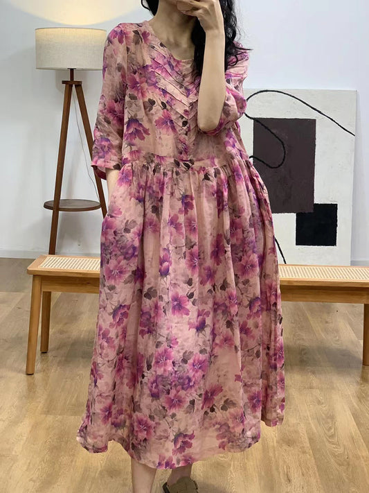 Robe d'été en ramie froncée à col en V et à fleurs artistiques pour femmes FG1010