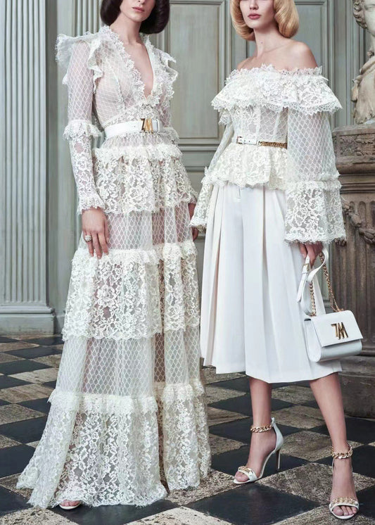 Robe noire ajustée en dentelle ajourée à col en V et manches longues AA1027