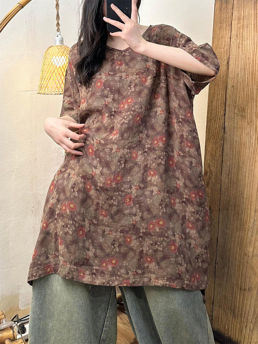 Robe d'été à col en V en ramie à fleurs vintage pour femme XX1028