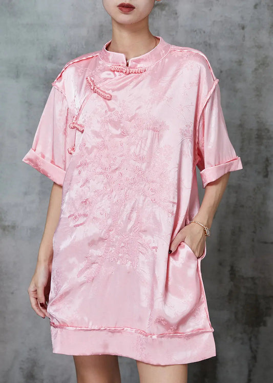 Belle mini-robe en soie rose brodée à boutons chinois Printemps JK1006
