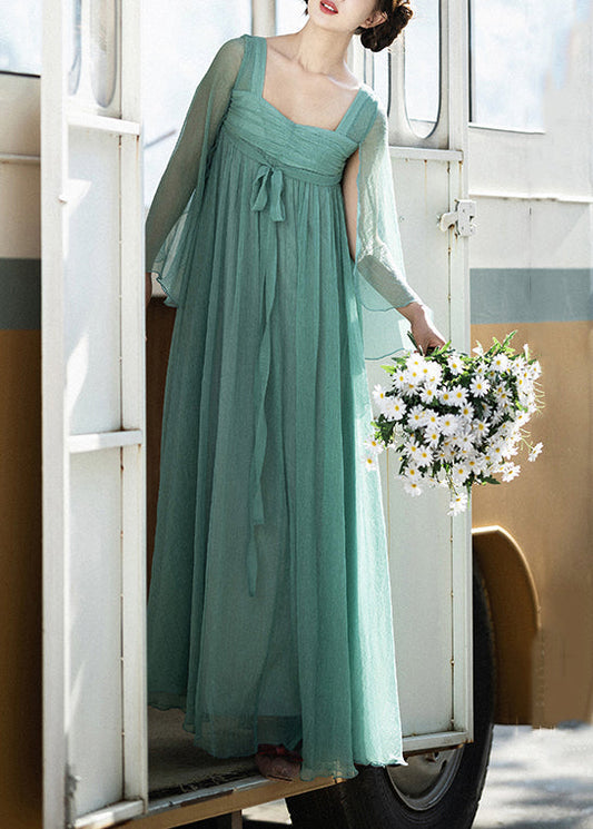 Robe élégante en mousseline de soie froissée à col carré vert à lacets pour l'été QA1063