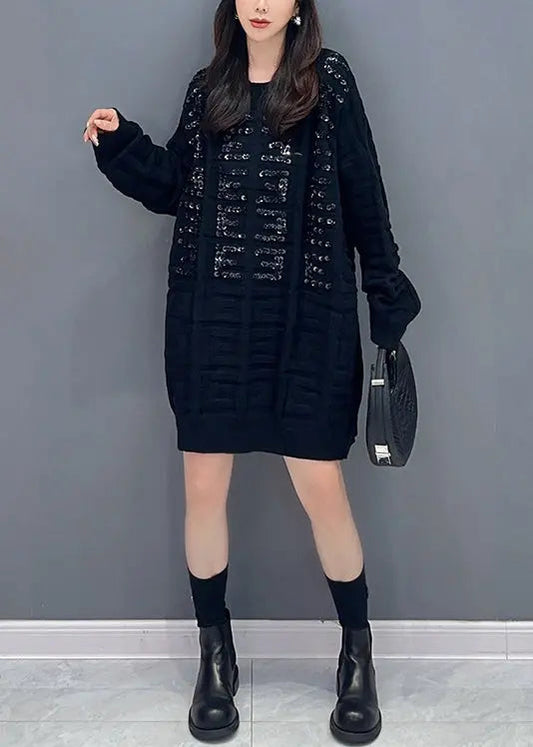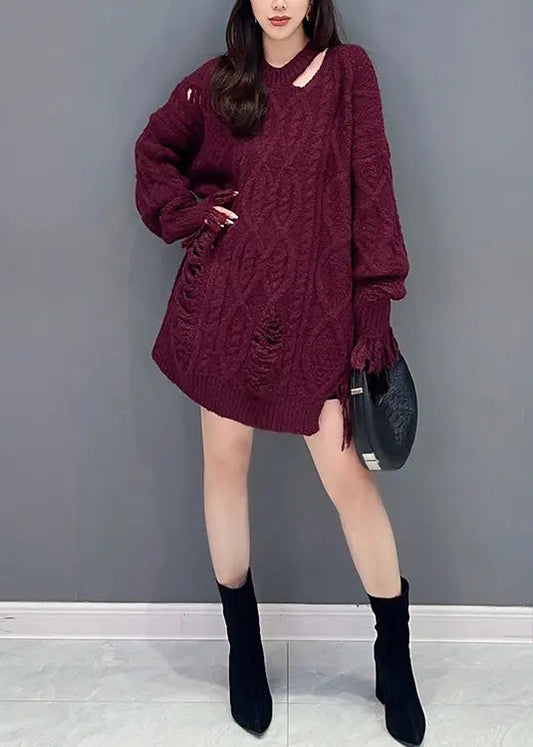 Robe pull mi-longue en tricot déchiré à pompons pour l'automne