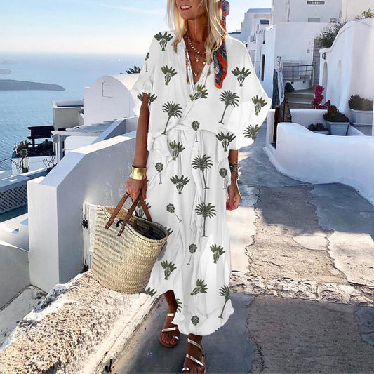Robe d'été décontractée pour femmes, sexy, col en V, manches lanternes, imprimé floral, élégante, ample, bohème, robe de plage WJ83