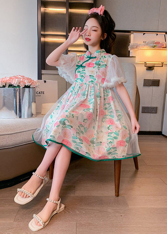 Belle robe d'été mi-longue à boutons en tulle et patchwork à col montant pour filles