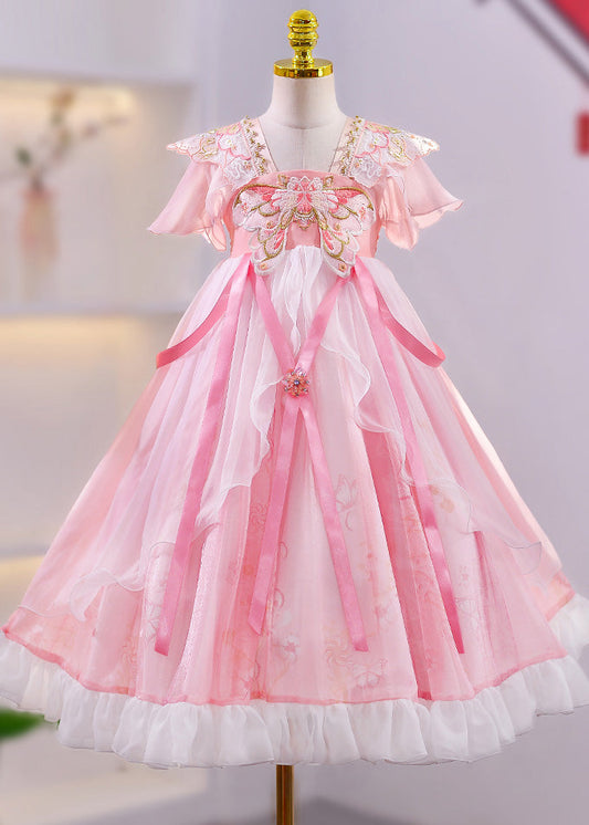 Robe mi-longue rose à col montant et manches courtes pour bébé fille en tulle et dentelle brodée