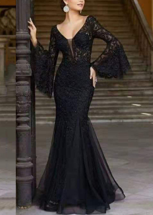 Robe en dentelle de soie à col en velours, printemps, patchwork en V français, noir