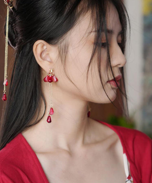 Boucles d'oreilles pendantes à pampilles en perles de verre et résine surdorées en cuivre rouge de style chinois QJ036