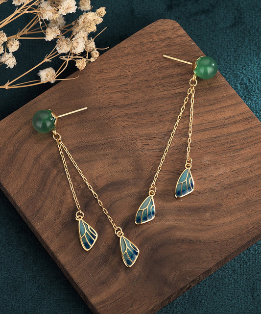 Boucles d'oreilles pendantes à pampilles en plumes cloisonnées en jade doré et or de style chinois antique Dharma AC1077