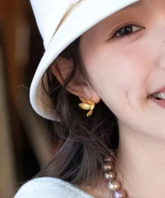 Boucles d'oreilles à tige modernes en argent sterling jaune avec petit oiseau surdoré QQ011