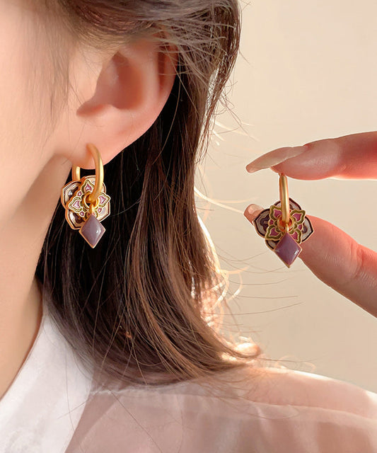 Boucles d'oreilles créoles élégantes en alliage de cuivre violet émaillé à motif floral QQ039