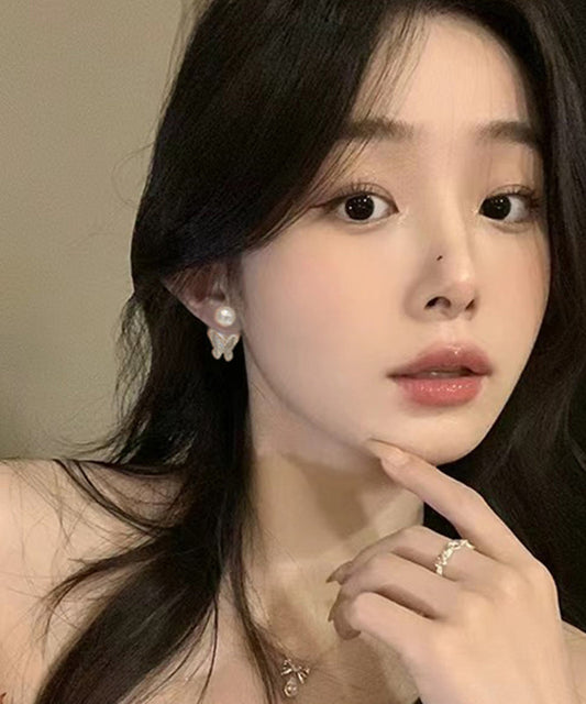 Boucles d'oreilles à tige élégantes en cuivre blanc avec perles et papillon ZZ050