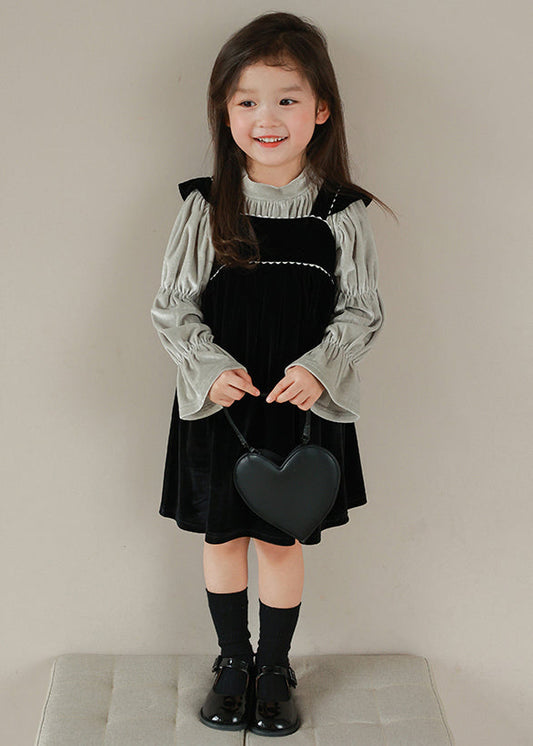 Ensemble deux pièces en velours froissé à col roulé noir pour fille avec manches évasées ML0048