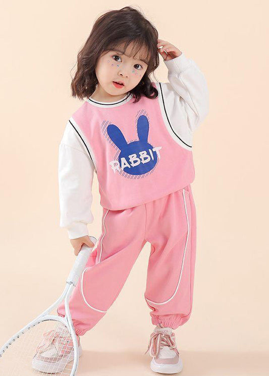 Ensemble deux pièces décontracté en coton rose à col rond et imprimé patchwork pour enfants, automne ML0045