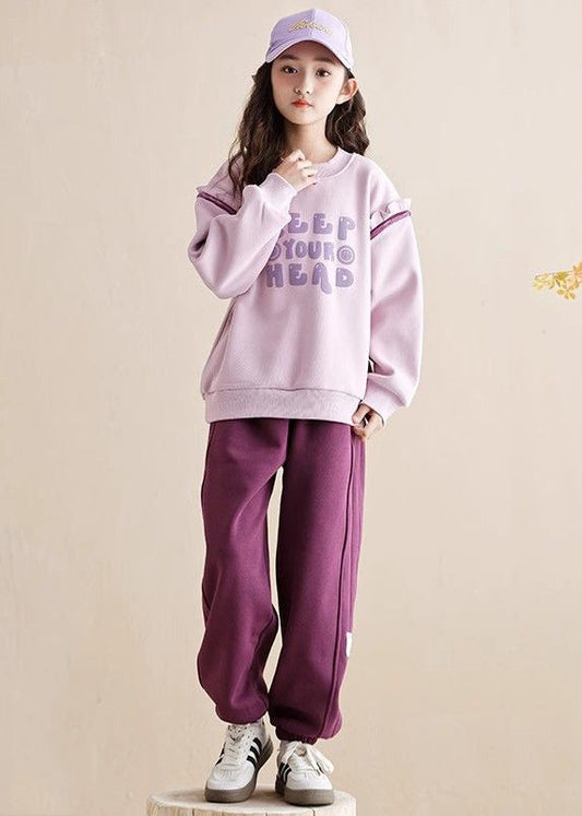 Ensemble deux pièces décontracté violet à volants pour enfants, sweat-shirt en polaire chaud et pantalon à volants, printemps TR010
