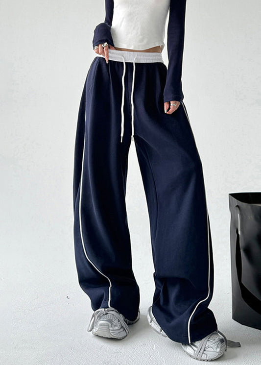 Pantalon large bleu marine à taille élastique et patchwork, printemps TA042