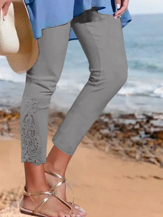 Pantalon décontracté en coton à boucle et dentelle patchwork uni QB103
