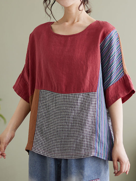 Chemise ample à manches courtes pour femme, grande taille, style vintage, patchwork, QW1031