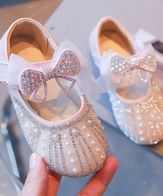 Chaussures beiges avec nœud et sangle élégante pour filles, perle pour boucle plate