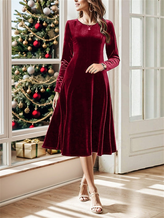 Women's Midi Dress Long Sleeve Velvet Burgundy Elegant