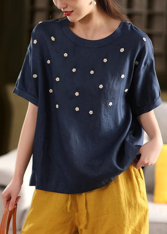 Embroidered Patchwork Summer Shirt Top Navy Linen Art