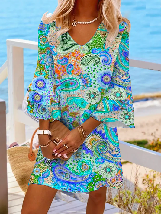 Robe courte ample à col en V pour femme style tribal bohème QPQ83