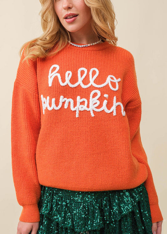 Pull en tricot ajouré orange à col rond et manches longues AE1010