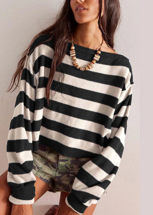 Pull court en tricot rayé bleu ample à col rond Automne QY032