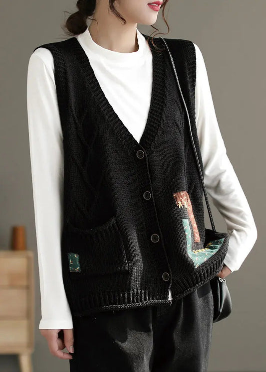 Gilet en tricot de coton beige français à col en V et poches boutonnées sans manches ML3375