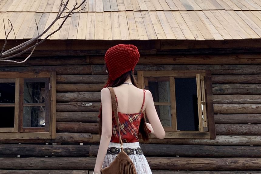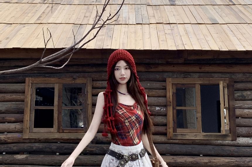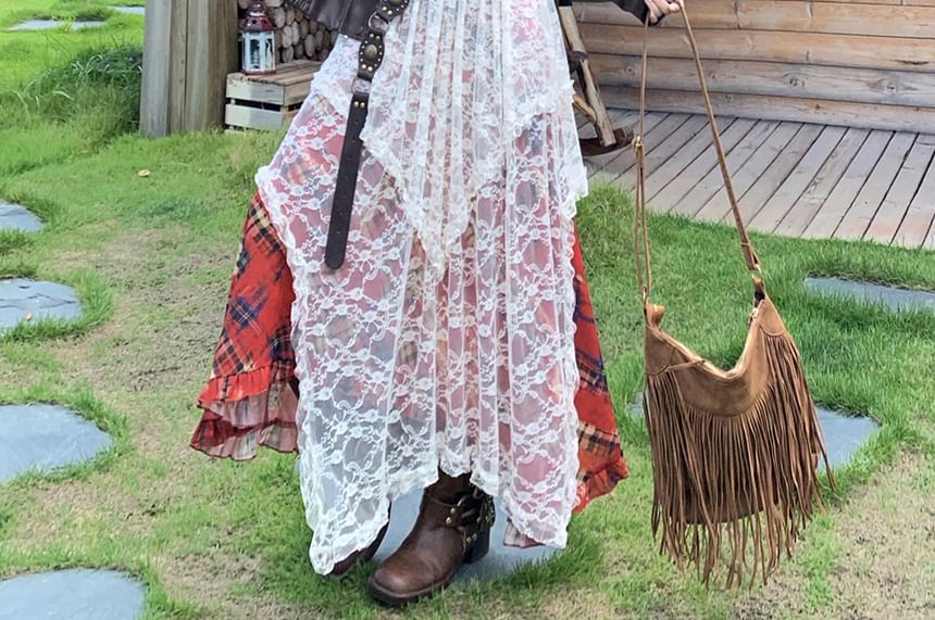 Collared Faux Leather Plain Zip Jacket / Spaghetti Strap Plaid Maxi A-Line Dress / High Waist Lace Maxi Skirt / Belt / Set
