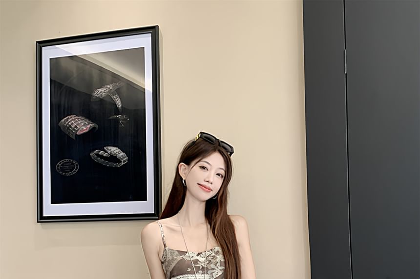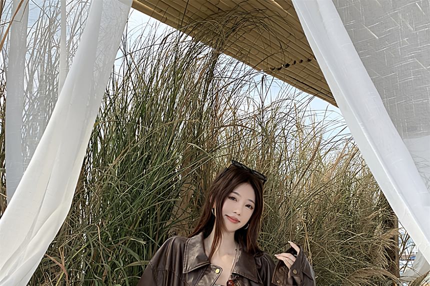 Collared Plain Faux Leather Jacket / Spaghetti Strap Print Mini A-Line Dress / Belt / Set
