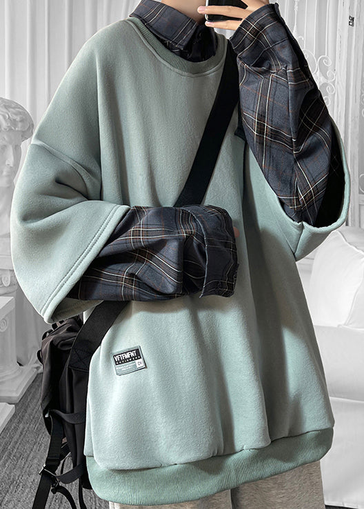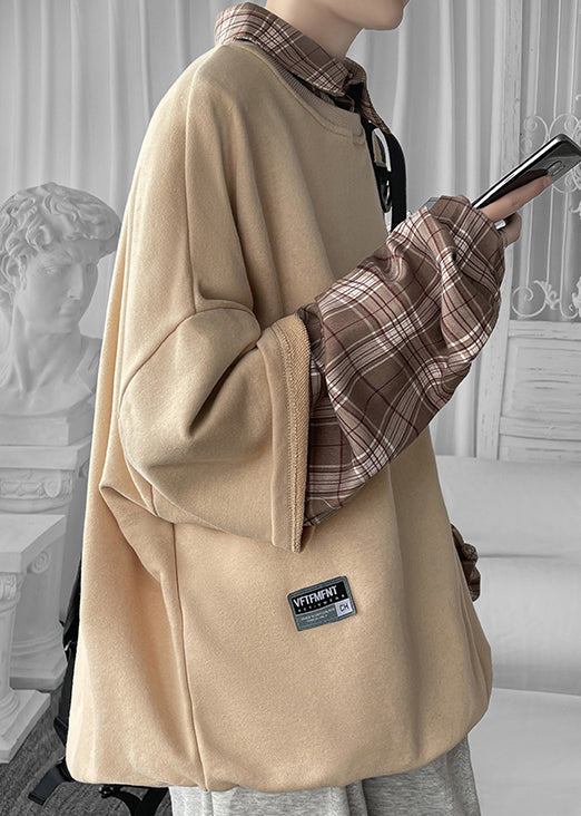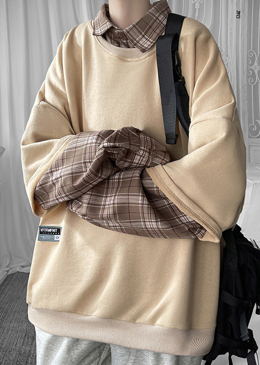 Sweat-shirt kaki à col Peter Pan pour homme, motif patchwork écossais en coton, printemps