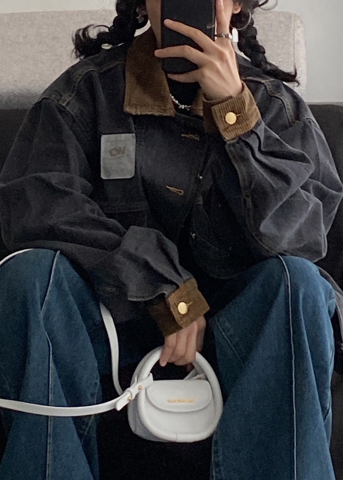 Manteaux homme en denim patchwork noir rétro avec poches boutonnées, printemps