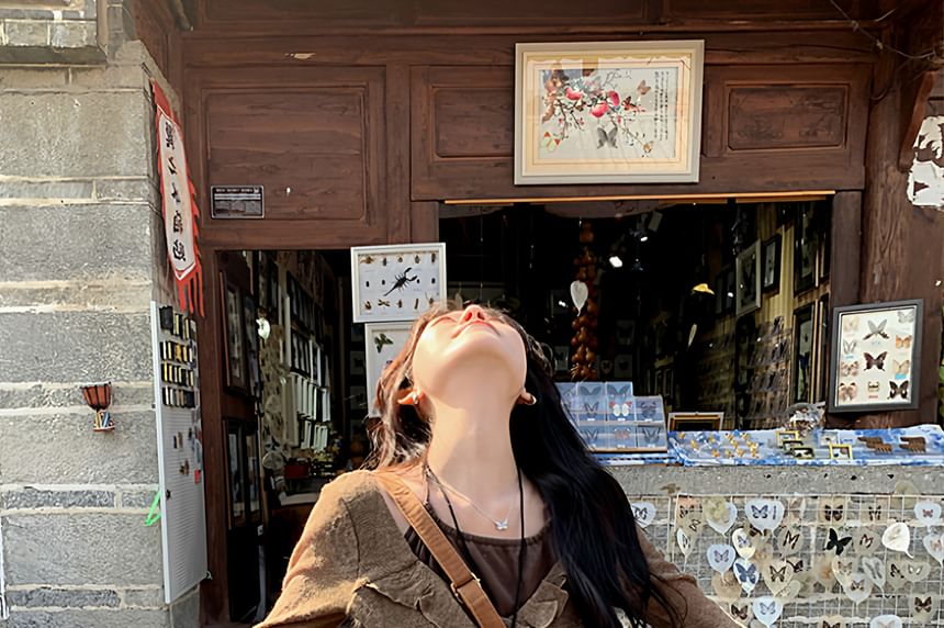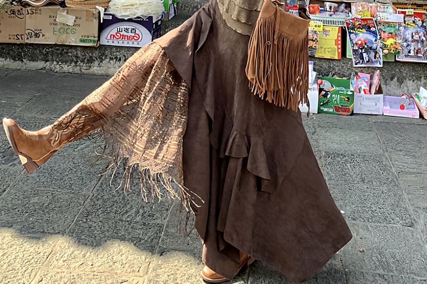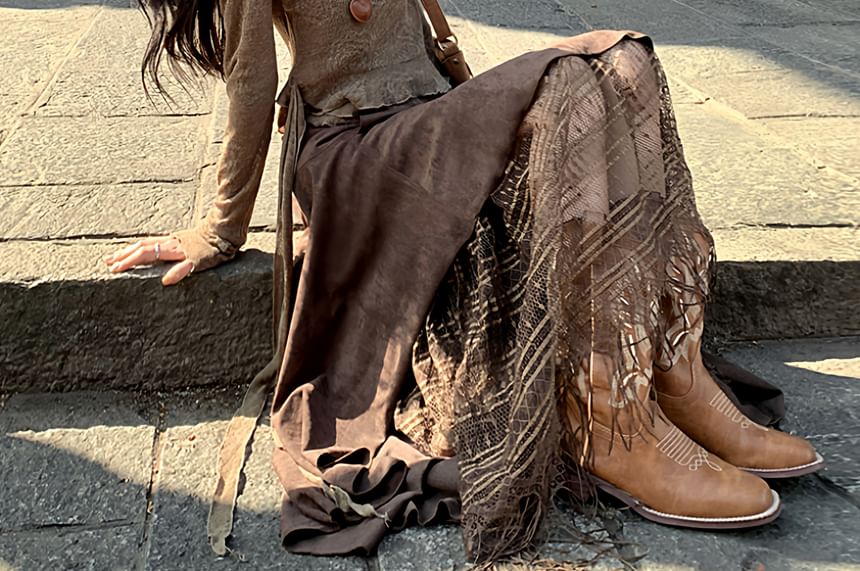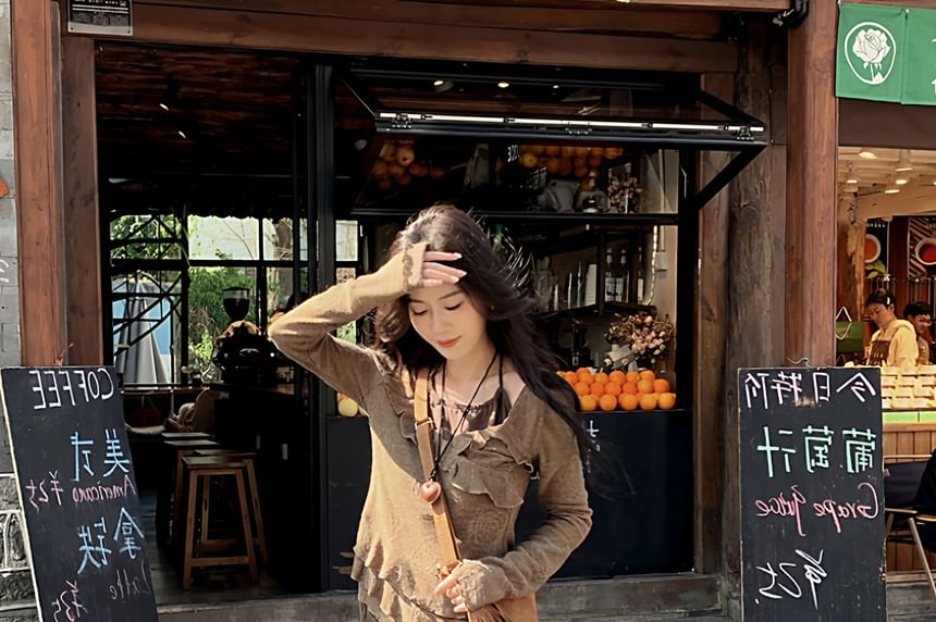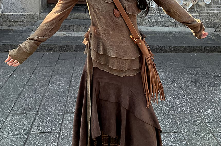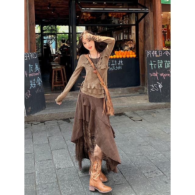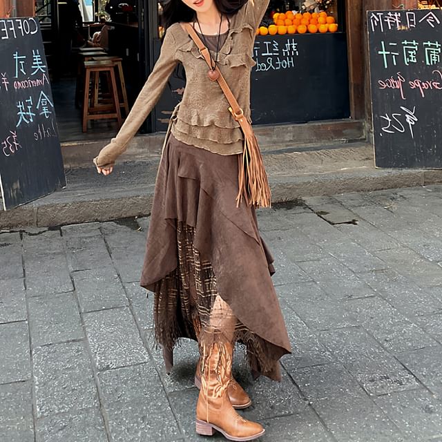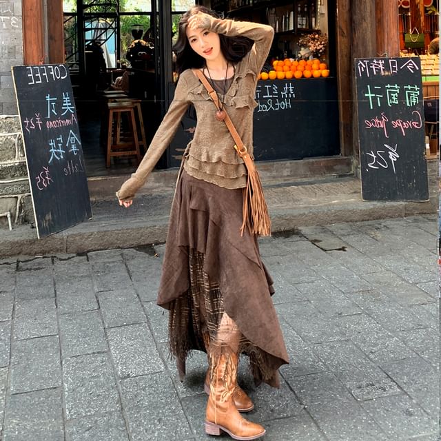Long Sleeve Halter Ruffle Tiered Mock Two Piece Top / High Rise Plaid Panel Asymmetrical Midi A-Line Skirt / Set
