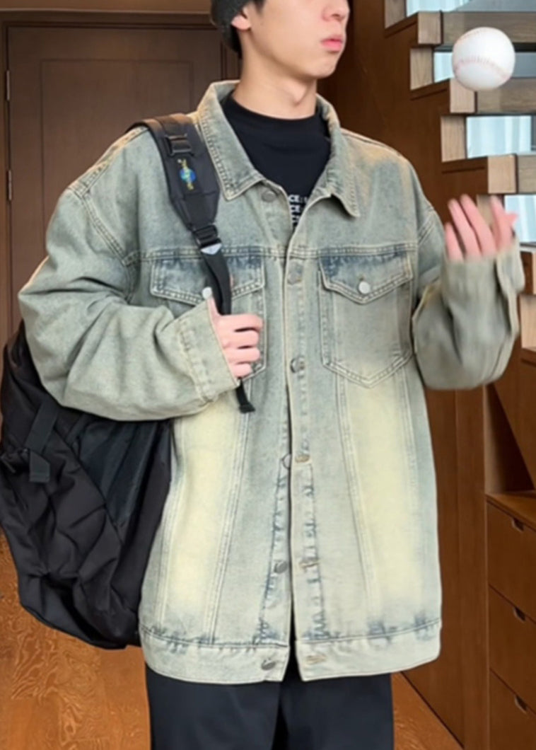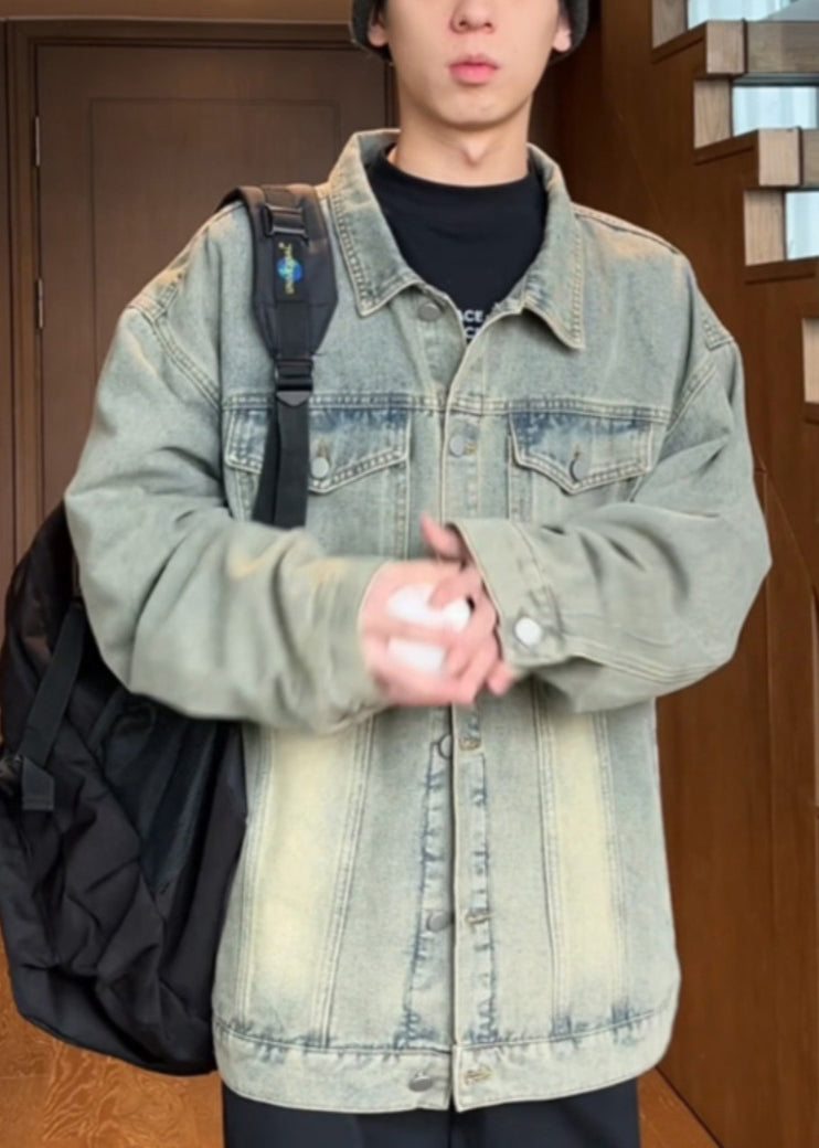 Manteau vintage en denim jaune boue pour homme, col Peter Pan, boutons, printemps