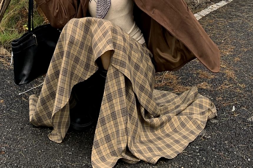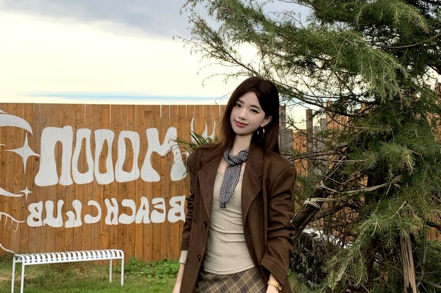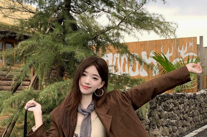 Notch Lapel Plain Faux Suede Single Breasted Blazer / Long Sleeve Scoop Neck Lettering Embroidered T-Shirt / High Rise Plaid Tassel Asymmetrical Maxi A-Line Skirt / Scarf / Set