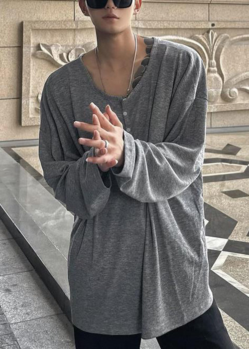 T-shirt simple à col rond et boutons en coton uni pour homme, printemps