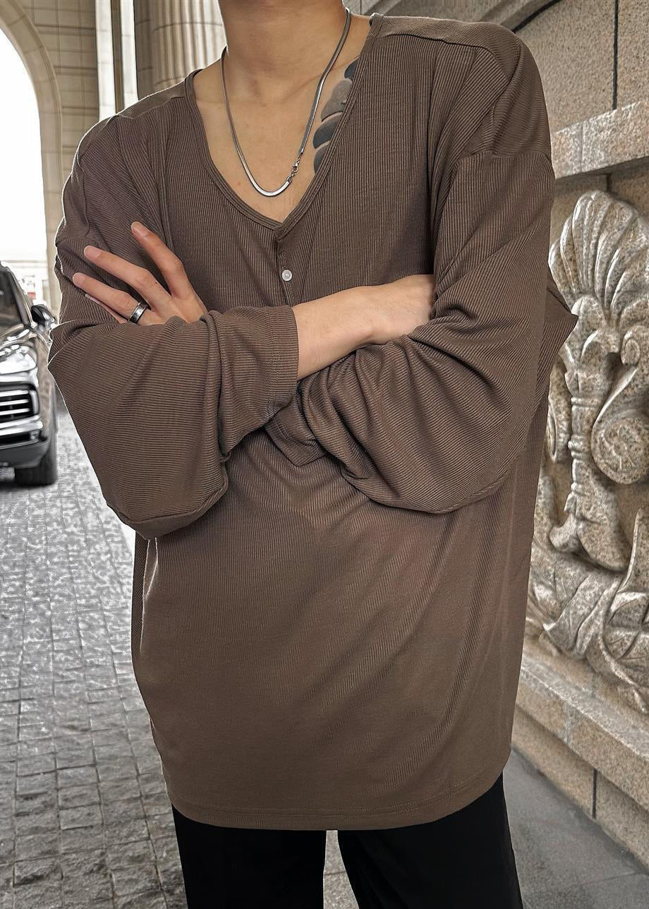 Chemises en coton pour hommes, col boutonné, simple, couleur unie, couleur café