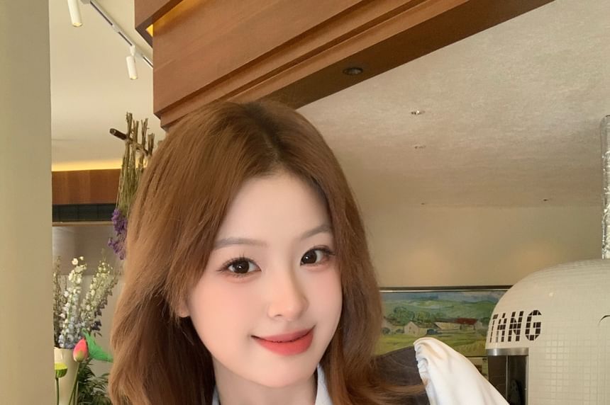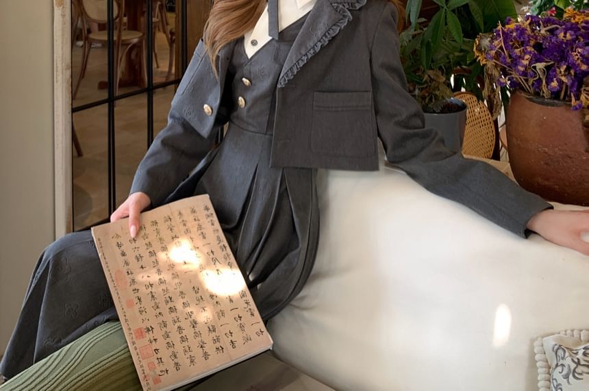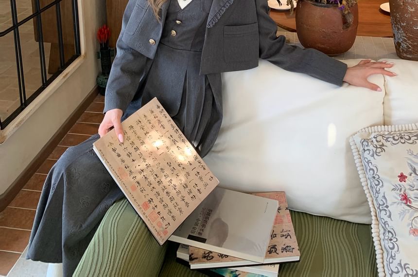 One buttoned Plain Crop Blazer / Long-Sleeve Two Tone Midi A-Line Dress / Set