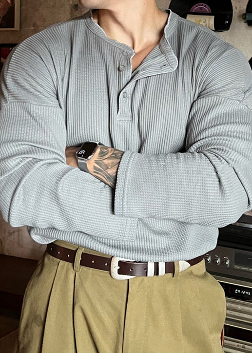 T-shirt ample gris à col rond et boutons en coton uni pour homme, printemps